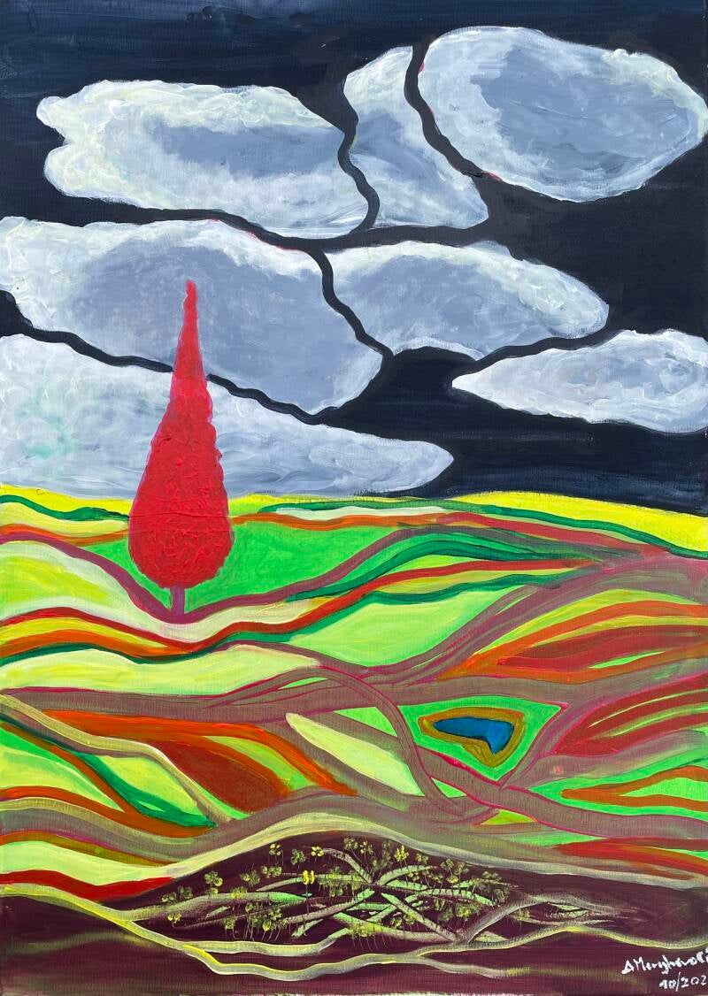 Descrizione: Il quadro intitolato “Natura selvaggia” presenta una scena fortemente espressiva e vibrante, dominata da colori intensi e pennellate decise. In primo piano si staglia un lupo solitario, scuro e ben definito, che si muove su una superficie d’acqua color turchese-verde. La sua presenza conferisce al dipinto un senso di mistero, forza e libertà. Sul fondo, una fitta foresta di conifere si accende di tonalità innaturali e suggestive: rossi accesi, gialli vividi, verdi smeraldo e blu elettrici si alternano in una danza cromatica che rende il paesaggio quasi onirico, surreale. Le forme degli alberi sono appena accennate, evocando una natura primordiale e incontaminata.La composizione crea un contrasto potente tra la quiete apparente del paesaggio e l’intensità emotiva data dai colori e dalla figura del lupo. Questo animale diventa simbolo della natura selvaggia, libera e indomabile, in un mondo che pare sospeso tra realtà e immaginazione.Il quadro comunica un senso di isolamento, ma anche di armonia con un ambiente selvaggio e vibrante, dove l’essere umano è assente e la natura regna sovrana.